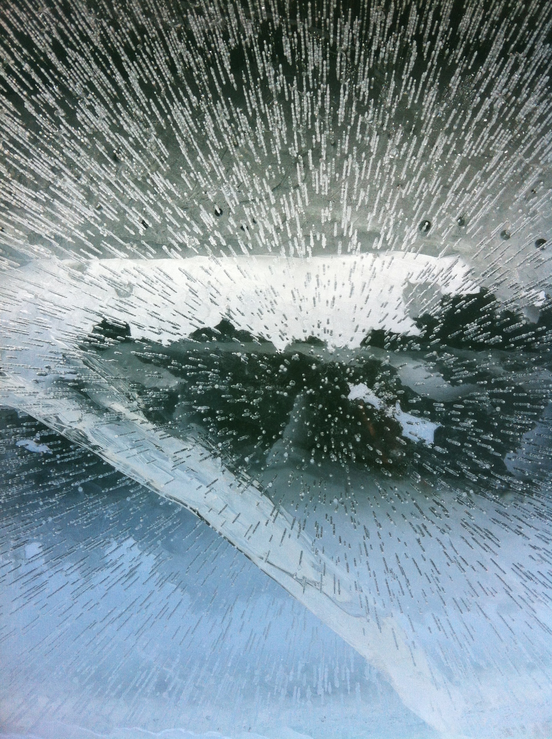 Returning for a third visit this morning, at sunrise, I spied birds’ wings made of ice trapped under the pond’s surface, and vertebrae, and skeletons. I saw the shape of two birds fighting each other, complete with feathers flying. I saw jellyfish, and shapes that looked like antique carousels, and baskets, and cages. I saw spirals trapped and motioning me down into the black depths. I took a few moments and lay down on the ice and stared at a 10 inch crack in the surface. I looked at it from one side and saw how the early morning sunlight was shining through its cracks, making it appear polka dotted, or etched by some invisible hand. I looked at it from the other side, and peered closely and noticed how much it echoed the shape of the mountain that stood in front of me, on the west side of the pond. I noticed the strings of bubbles and noted how similar their patterns are to the way cave glow-worms hang, or the shape of the nails and pins we use to build houses. As my friend and I lay there, bundled up against the cold, on our bellies, gazing into the ice, a huge boom echoed below us as a new, large crack formed somewhere behind us. The boom, the cracking, was so forceful it shook us: you could feel the vibration all through your body. At that moment, we stood up and skated around each other again for a few moments, savouring the serendipity and the silence and silkiness of perfect ice, and then went off to begin the day.