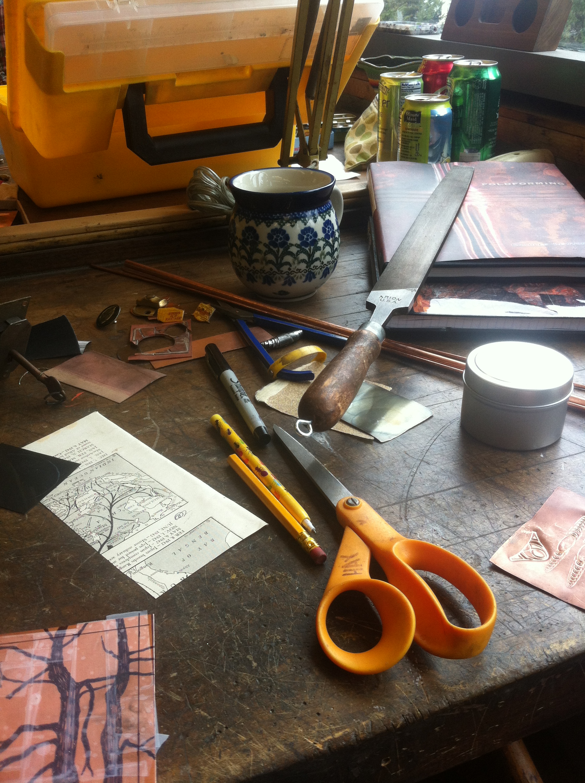 Haystack helped me understand something about myself: that I crave the night spaces, the dark times, and that I like to work uninterrupted by others. I can work with others, as long as do not have to interact with them very much. The first night at Haystack I experimented with tools like the hydraulic press and their very fancy rolling mill and their many daps and dapping stumps and made a really beautiful, tiny vessel that looks, almost, like an autumn leaf.
